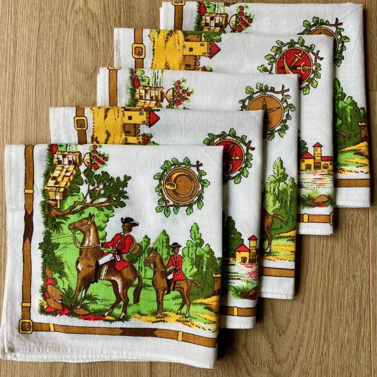 Set of five old napkins with scenes from La Chasse (hunting scenes)
