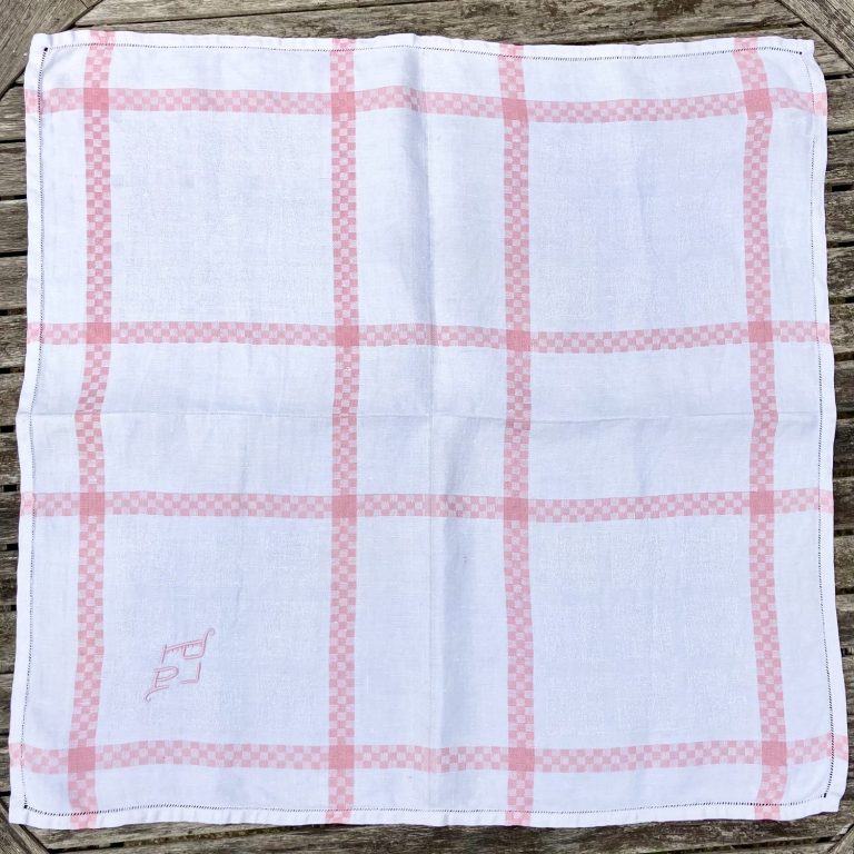 Monogram "PP" in charming embroidery in one corner. Approximately 65cm square (2 feet square). Freshly laundered and ironed.