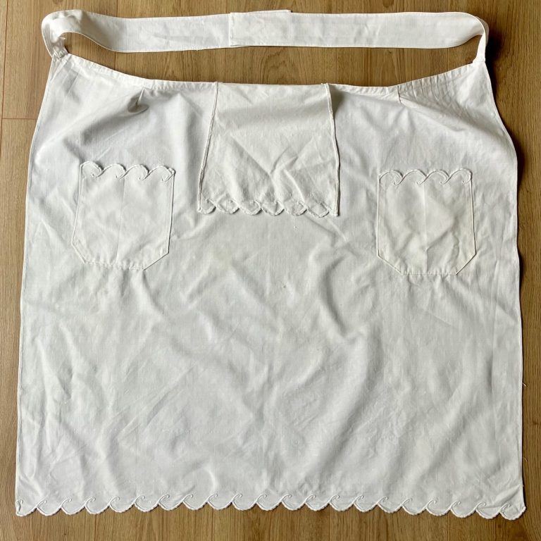 Beautiful old French long bistro apron in crisp white linen with two pockets. Lovely scalloped bottom edge on the apron and on the top of the pockets. In immaculate vintage condition with no stains, marks, or holes.