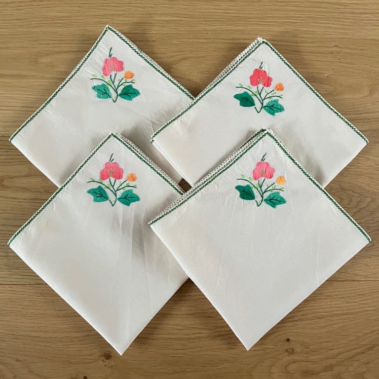 Four vintage French napkins with embroidered flowers