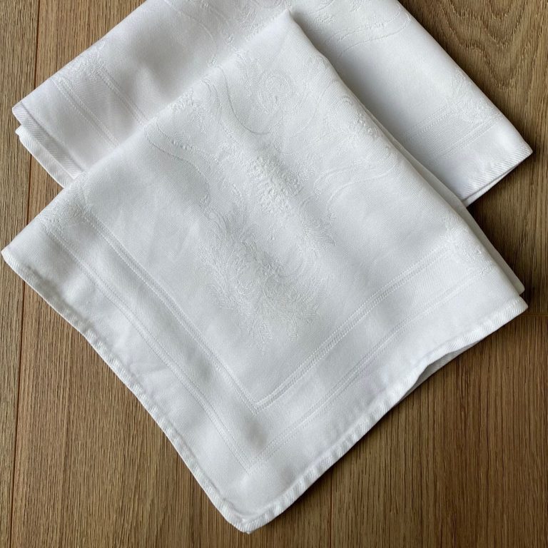 Set of two large vintage French linen napkins with a lovely damask design. Each cloth napkin is approx. 47cm square. Plain white linen in excellent, as-new condition. Freshly laundered and ironed.