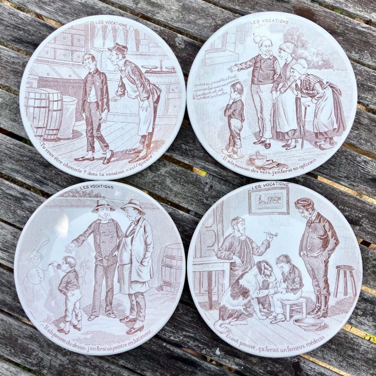 These white and brown ceramic plates feature finely detailed, satirical illustrations of “Les Vocations” (Jobs) with captions in French, capturing the spirit and humor of 19th/early 20th-century French life.