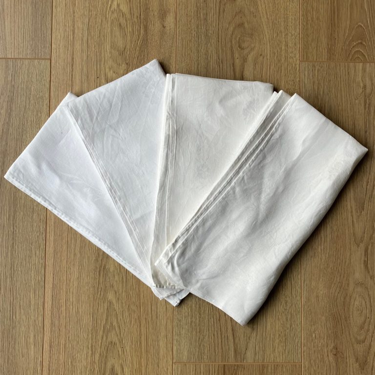 Set of four oversized vintage French linen napkins with a lovely damask floral design. Each cloth napkin is approx. 65cm square. Plain white linen in excellent, as-new condition. Freshly laundered and ironed.
