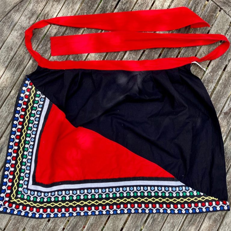 Gorgeous vintage French half apron with front pocket. Black 100% cotton with multi-coloured braid along two edges and red diagonal pocket and waist-ties. Made by Pierre Teck Tissages in France. Bought in central France and freshly laundered and ironed.