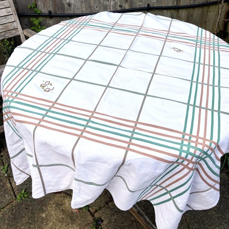 White linen with pink checkerboard stripes and embroidered edging. In great condition with no stains or holes.