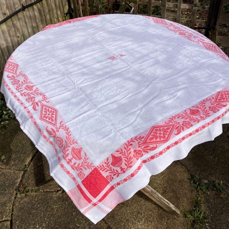 Charming white vintage French tablecloth with monogram YM in the centre and red floral design around the edge. Approx. 1.2 metres square - can be used on a square or a round table