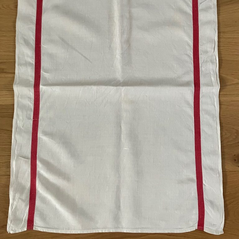 Beautiful white vintage linen tea towel from France with a red stripe along the long edge Large size, approx. 75cm by 58cm. Lovely fabric quality. Tape loop for easy hanging.