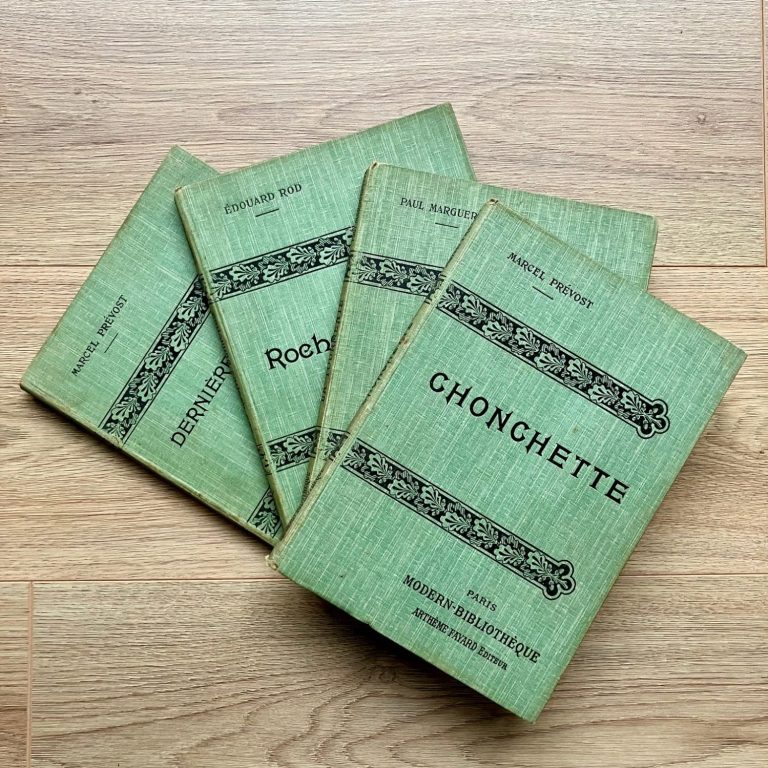 The books are: Chonchette, La Tourmente, Les Roches Blanches, Dernieres Lettres des Femmes. None of the books are dated but internet searches would place them all around 1910. The book bundle consists of four books which will cover space/make a stack of 5cm/2inches and they are all around 24cm/9 ½ inches tall.
